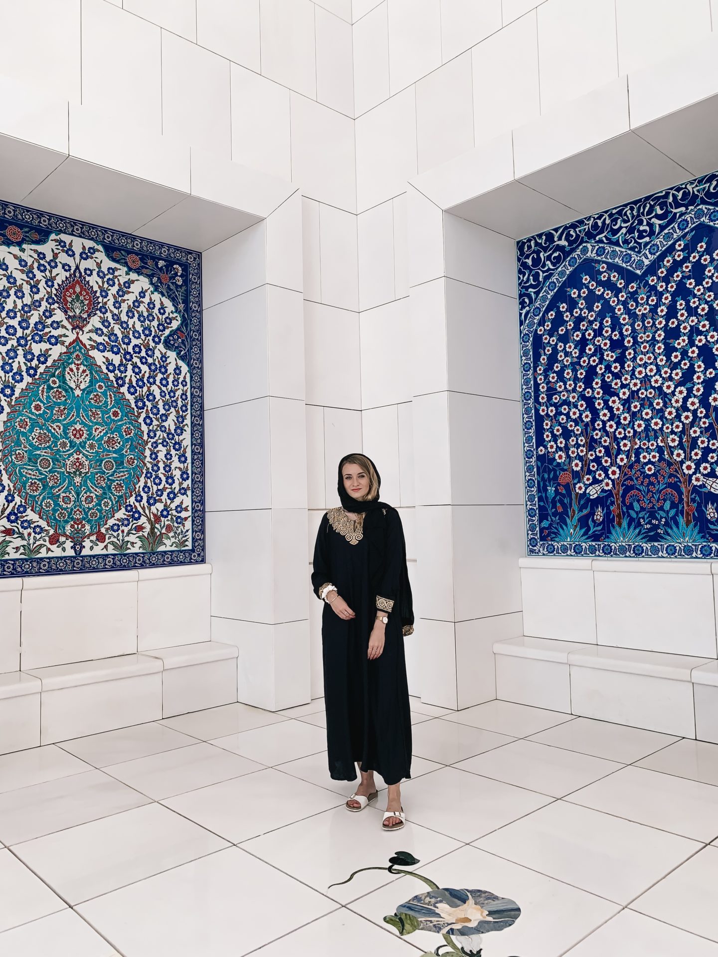 Unser erster Stopp war die Sheikh Zayed Mosque. Bereits im Kleinbus bekamen wir Frauen von unserem Guide sogenannte „Abayas“ ausgehändigt; Gewänder mit Kopftuch, die wir für den Aufenthalt innerhalb der Moschee tragen mussten. Hat mich gar nicht gestört, im Gegenteil fand ich es irgendwie spannend, sich komplett darauf einzulassen – einzig der Fakt, dass wir absolut ungeübt im Binden sind und das Tuch ständig verrutscht ist, war etwas anstrengend. Aber Übung macht wie bei allem auf der Welt wohl auch da den Meister…