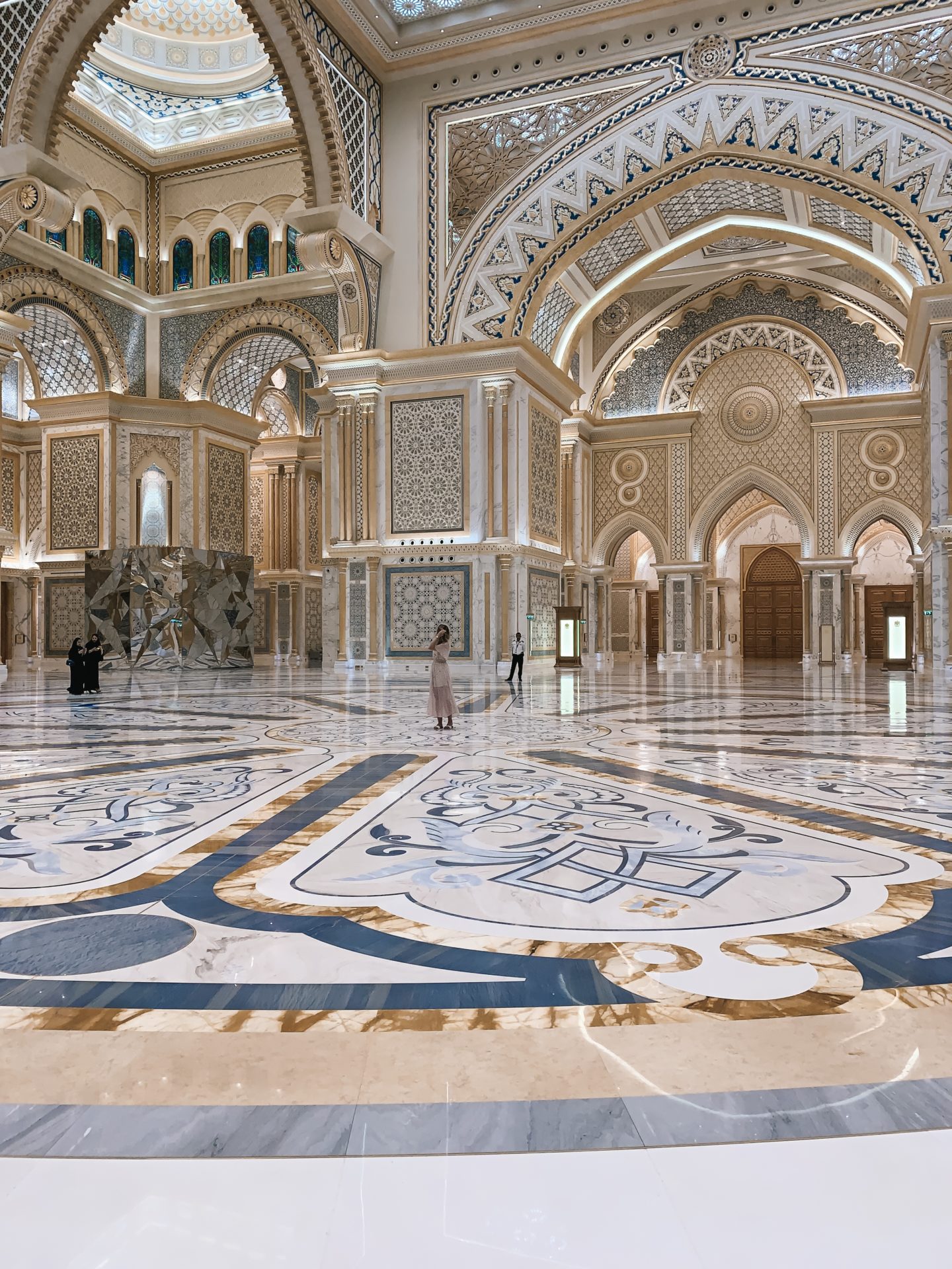 Der Präsidentenpalast Qasr al Watan war noch mal eine ganz andere Nummer und nicht weniger schön als die Sheikh Zayid Moschee. Ich kann guten Gewissens sagen, dass ich auch so etwas noch nie in meinem Leben gesehen habe – trotz zahlreicher Reisen, besuchter Sehenswürdigkeiten, Kirchen, Tempel und anderer, imposanter Gebäude. Der Präsidentenpalast wurde übrigens erst im März dieses Jahres für Besucher geöffnet – wir hatten also Glück!