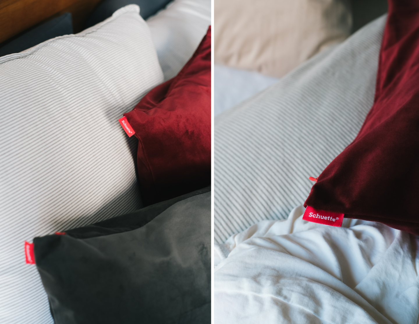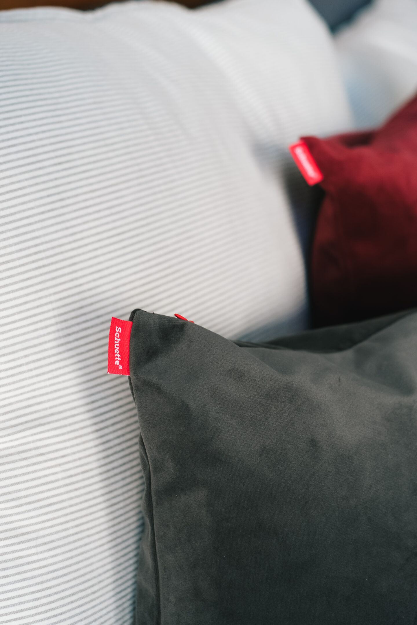 Für ein Extra an Gemütlichkeit im Schlafzimmer habe ich noch ein paar neue Kissenbezüge von Schuette® bestellt: Drei weiche Bezüge aus Samt aus der exklusiven Millenium Velvet Kollektion. Der weiche Samtstoff fühlt sich nicht nur super angenehm an, sondern wirkt gleichzeitig hochwertig und ruhig, ohne zu schwer oder dominant im Schlafzimmer zu wirken. Übrigens – wenn ihr genauso auf Einheitlichkeit steht wie ich: Die Millenium Velvet Kissenbezüge bestehen aus dem gleichen Stoff wie die Millenium Velvet Vorhänge, ihr könnt sie also praktisch als zusammen passendes Set in der selben Farbe und Haptik bestellen.